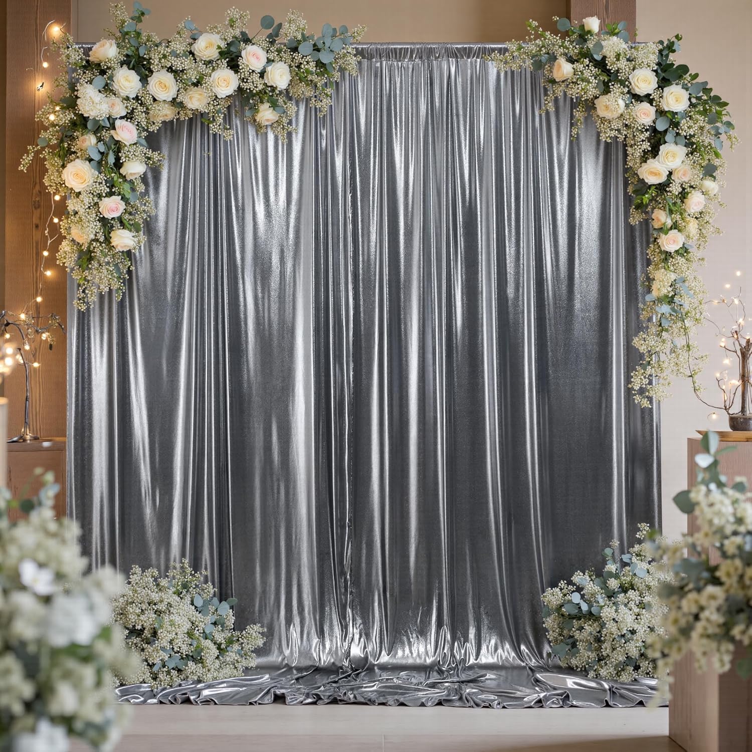 - Easy to Care Black Silver Shimmer Curtains Our 10ft Black Silver sequin glitter party background curtain panels are made of wrinkle-free material, which could be used without ironing. Let you make unforgettable memories for your family or your friends.