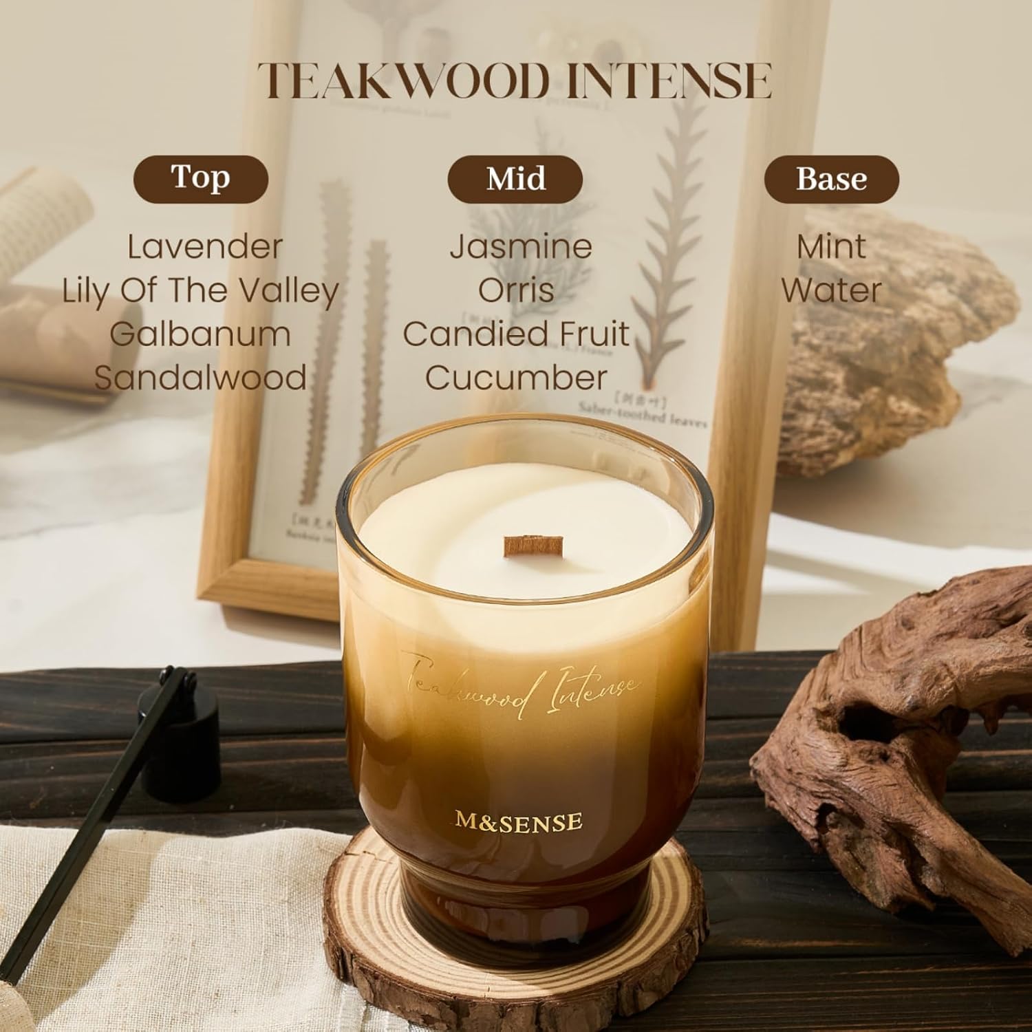 M&SENSE 16.6oz Natural Soy Large Jar Candle with Wooden Wick | Teakwood Intense Scent | 95-Hour Burn & Long-Lasting Burn | Housewarming Gift for Men and Women