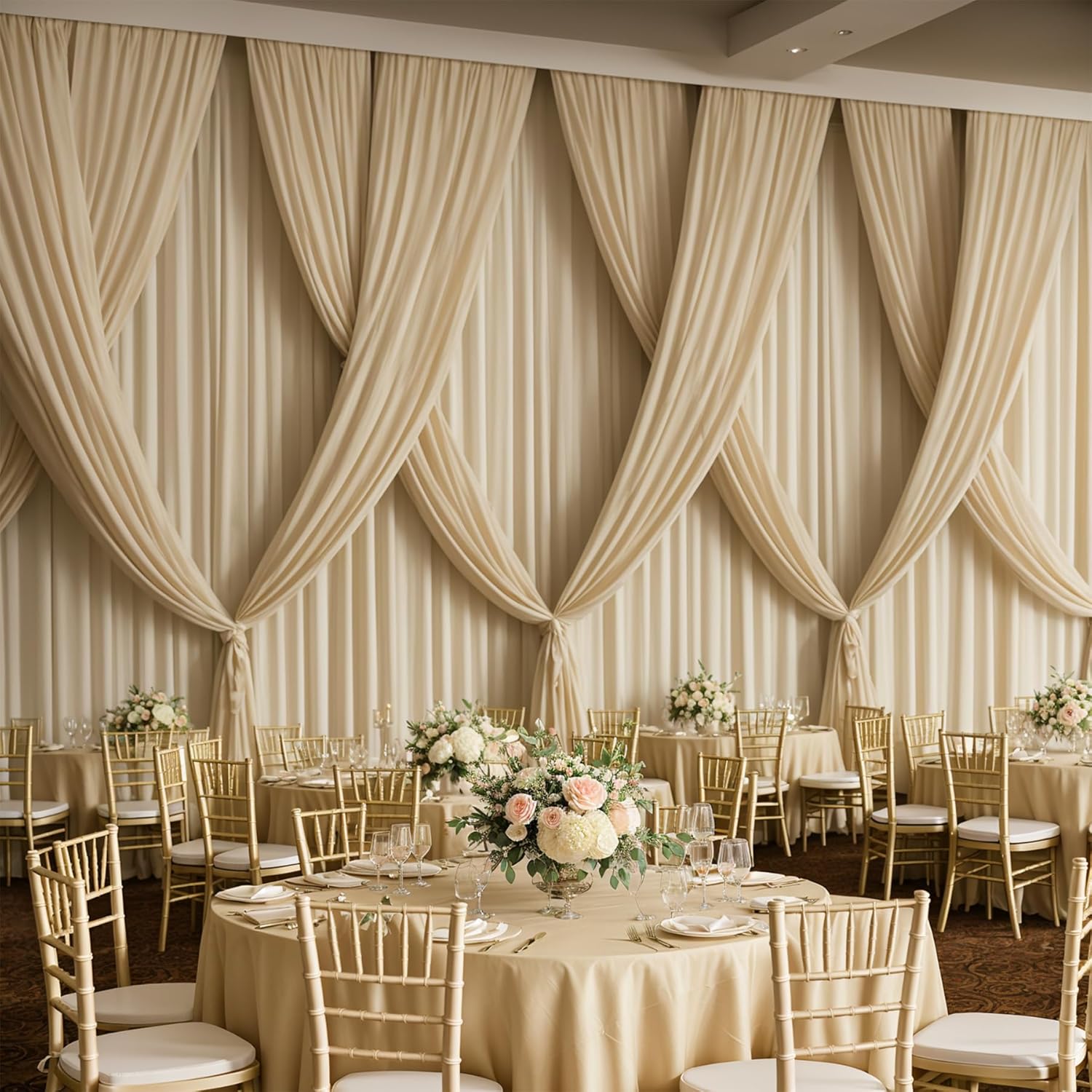 PartyVillage 50ft×15ft Beige Backdrop Curtain for Wedding Parties, 10 Panels Wrinkle Free 15 FT Long Polyester Photo Backdrop Drapes Back Drop Cloth for Birthday Photography Background