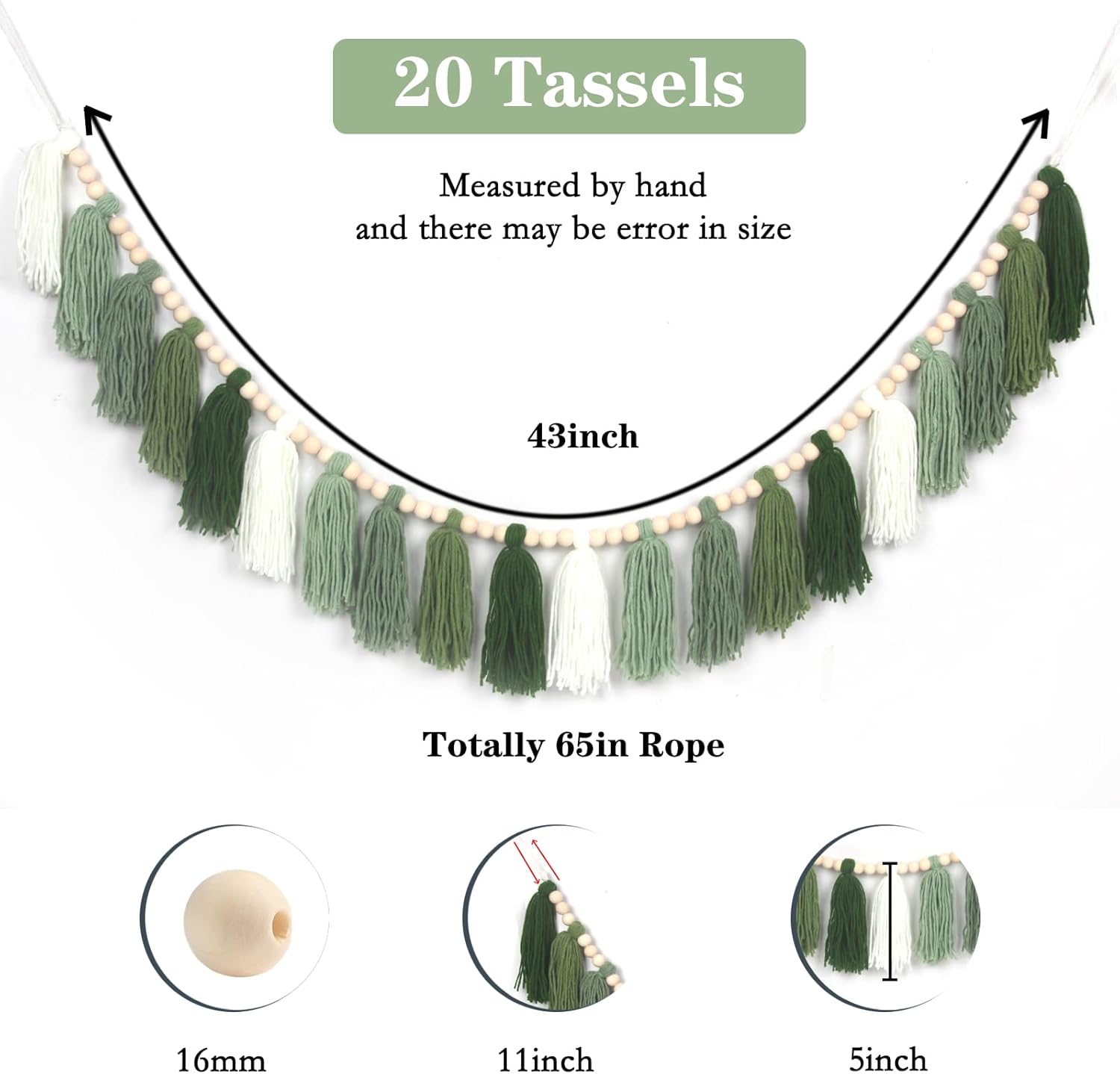 - 【Ideal Size for Decoration】Features 20 handmade luxuriously tassels (5" each). The tassels section is approximately 43in long. The total length is 65inches included both hanging hoop. Artisan-crafted with slight size variations.