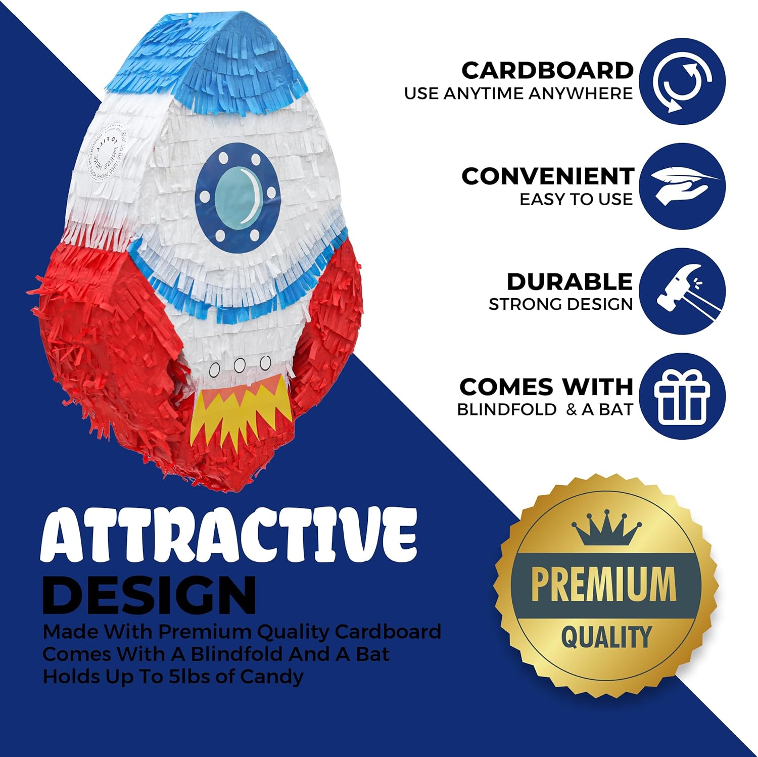- ❤️【 PREMIUM QUALITY 】- The rocket pinatas measures 16.5x11.4x4 inches. Made with high and resistant cardboard. Decorated with crepe paper on bond paper, high strength plastic loop to hang. Premium material ensures its durability and fancy looking. It comes with a blindfold and bat to make more fun.