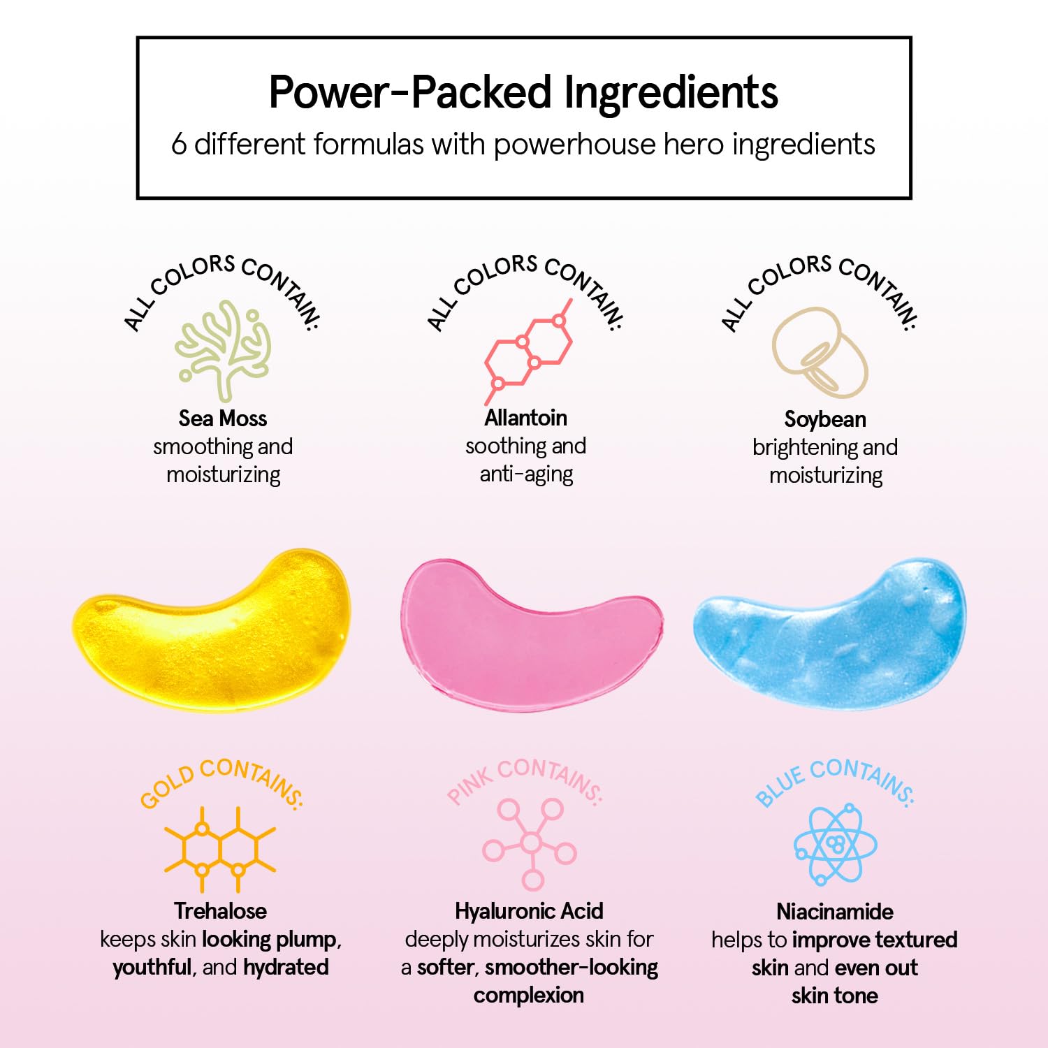 - The Ultimate Eye Mask Pack - Love our undereye mask patches? Experience all 6 colors with our 18-pair variety pack. You get 3 pairs each of our gold, pink, blue, purple, bronze, and pearl under eye masks for you and your besties to refresh & relax.