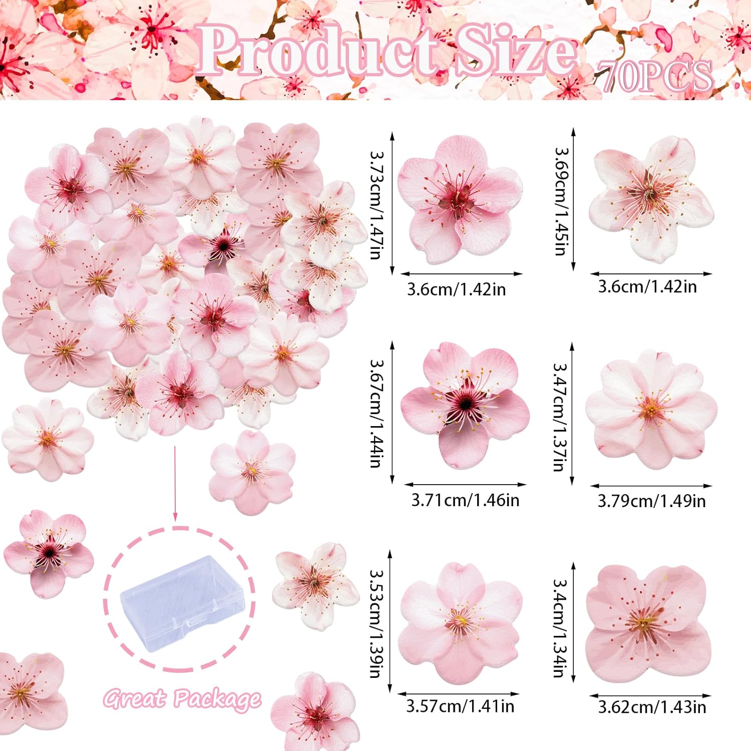 - Package included: Includes 70 pcs edible cherry blossoms cupcake toppers with a box,very lightweight, portable and easy to store and carry.Sufficient quantity can meet your different decoration needs.The size is 1.7*1.9inch /1.18*1.2inch. It is completely edible but not delicious,so pretty tasteless (Not Sweet)