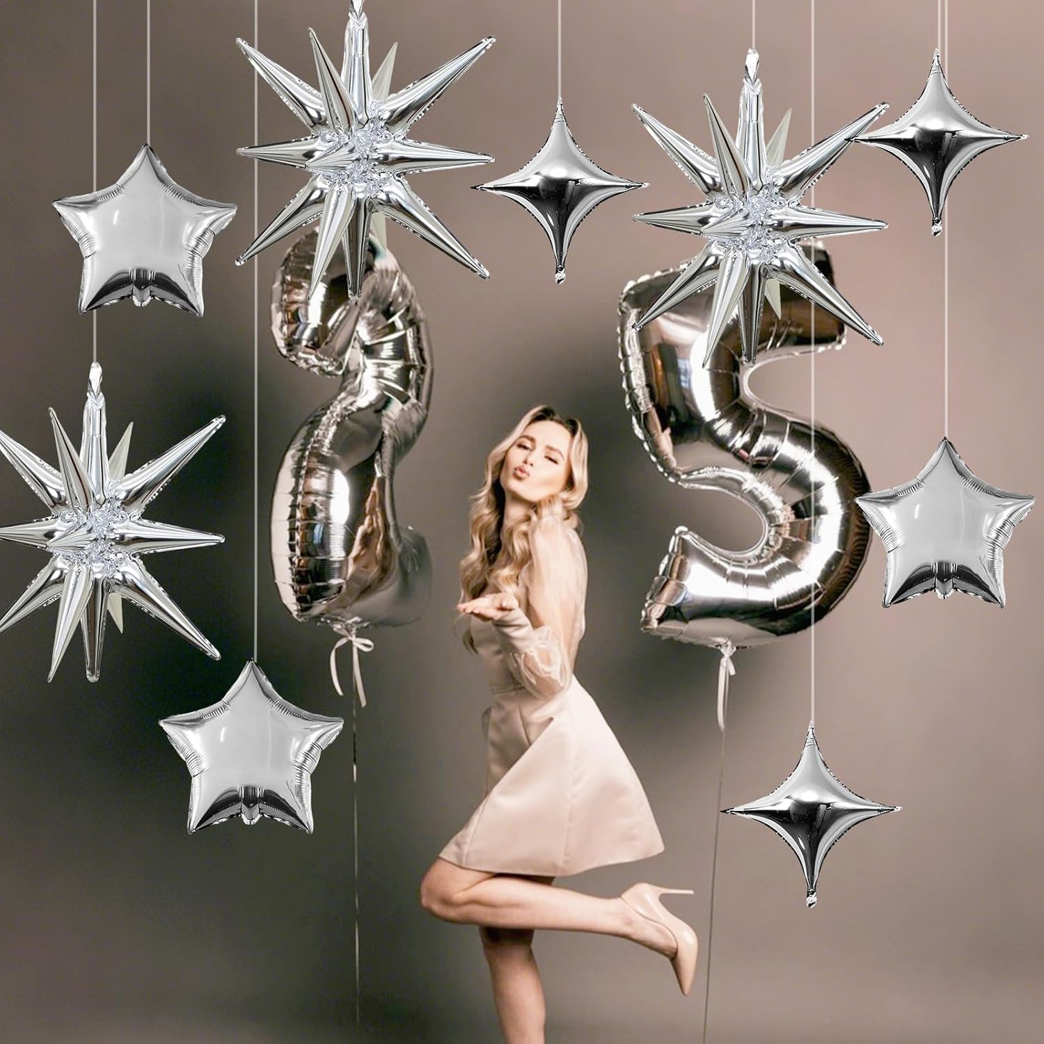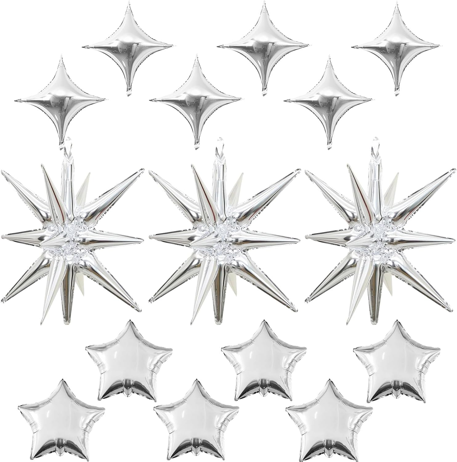 - Silver Star Balloons Set: Package includes: silver aluminum foil star balloons (explosion stars × 3, four-pointed stars × 6, five-pointed stars × 6) , a straw and ribbon