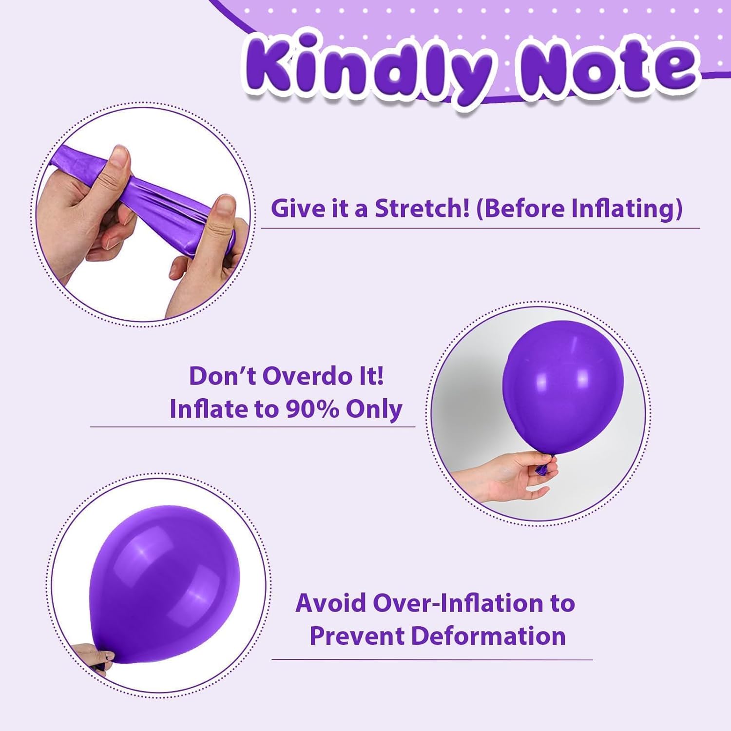 - Party-Ready Tips: Please be careful not to overfill the balloon to avoid bursting,away from sharp objects and direct sunlight to prevent damage. Please note that it is normal for 2-3 balloons out of the all to have some damage or small holes. If you have any questions or need assistance, please don't hesitate let us know.We will help you within 24 hours.