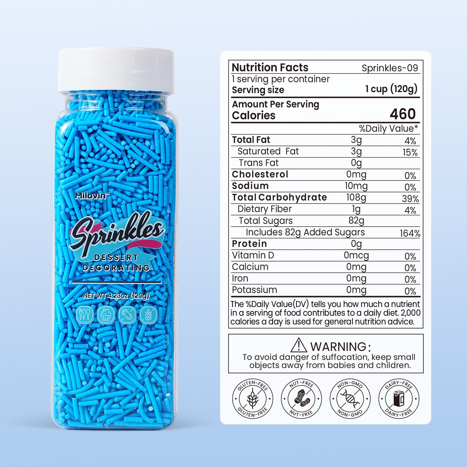 - High Quality and Safe: Made with food-grade ingredients. Edible, Gluten-free, Nut-free, Dairy-free, Non-GMO. Our blue jimmies sprinkles meet American food standards and guard your and your family's health