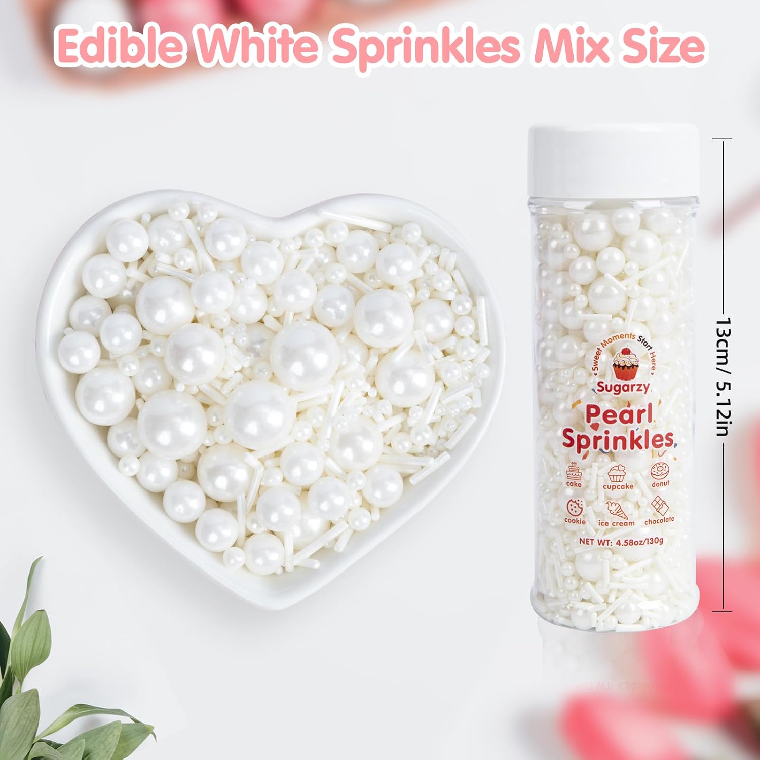 Edible White Sprinkles for Cake Decorating,Edible Pearl Jimmies Sugar Mix Size 130g/4.58oz,Baking Candy Decorations,Cupcake Toppers,Cookie Donuts Ice Cream Dessert Decorating,Wedding Birthday Party Valentines Christmas Supplies