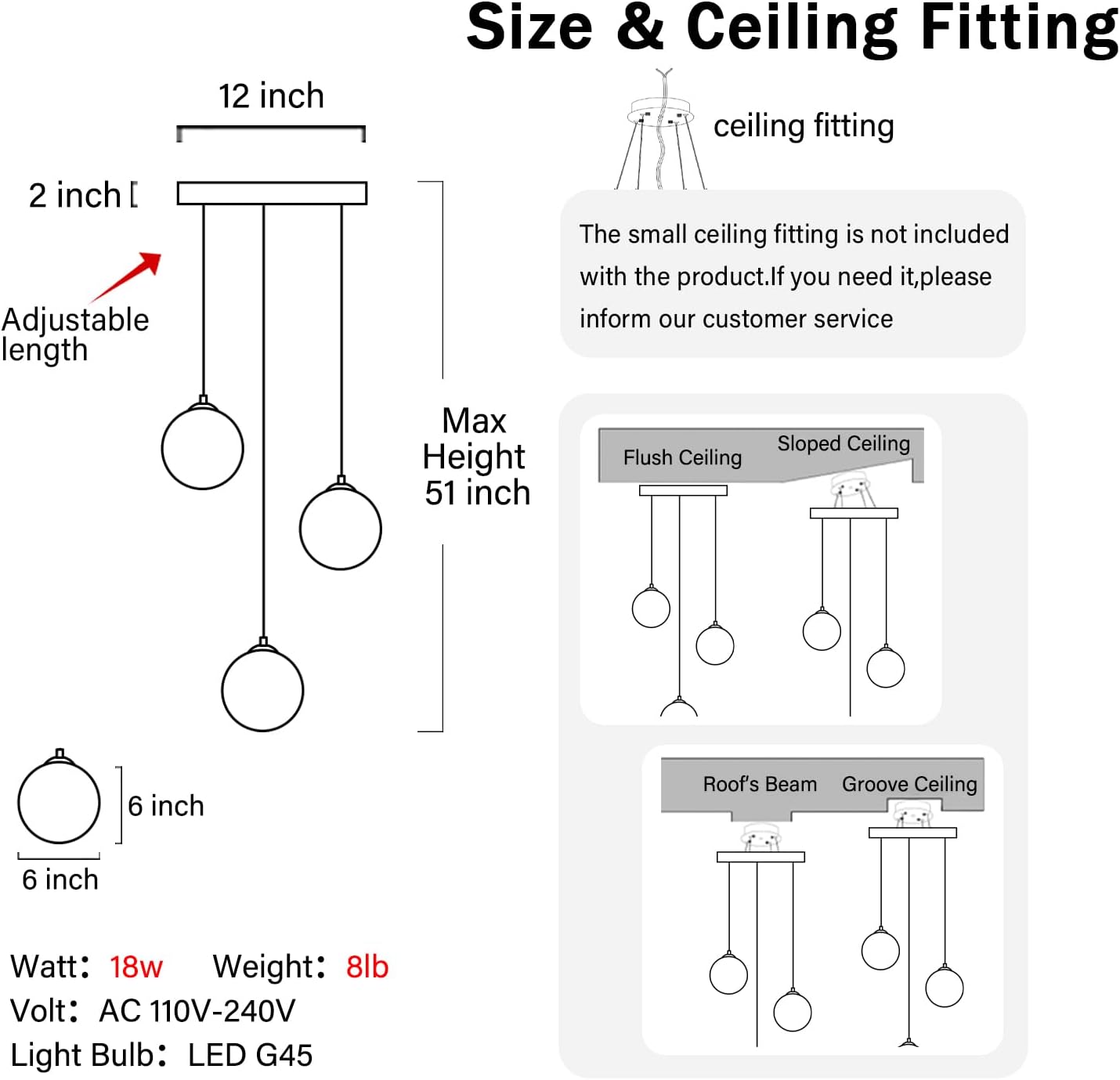 - 【Glass Chandelier Size】Chandelier ceiling plate diameter: 12 inch, Chandelier max height: 51inch.Crystal size:W 6inch * H 6inch,The chandelier weighs about 8LB