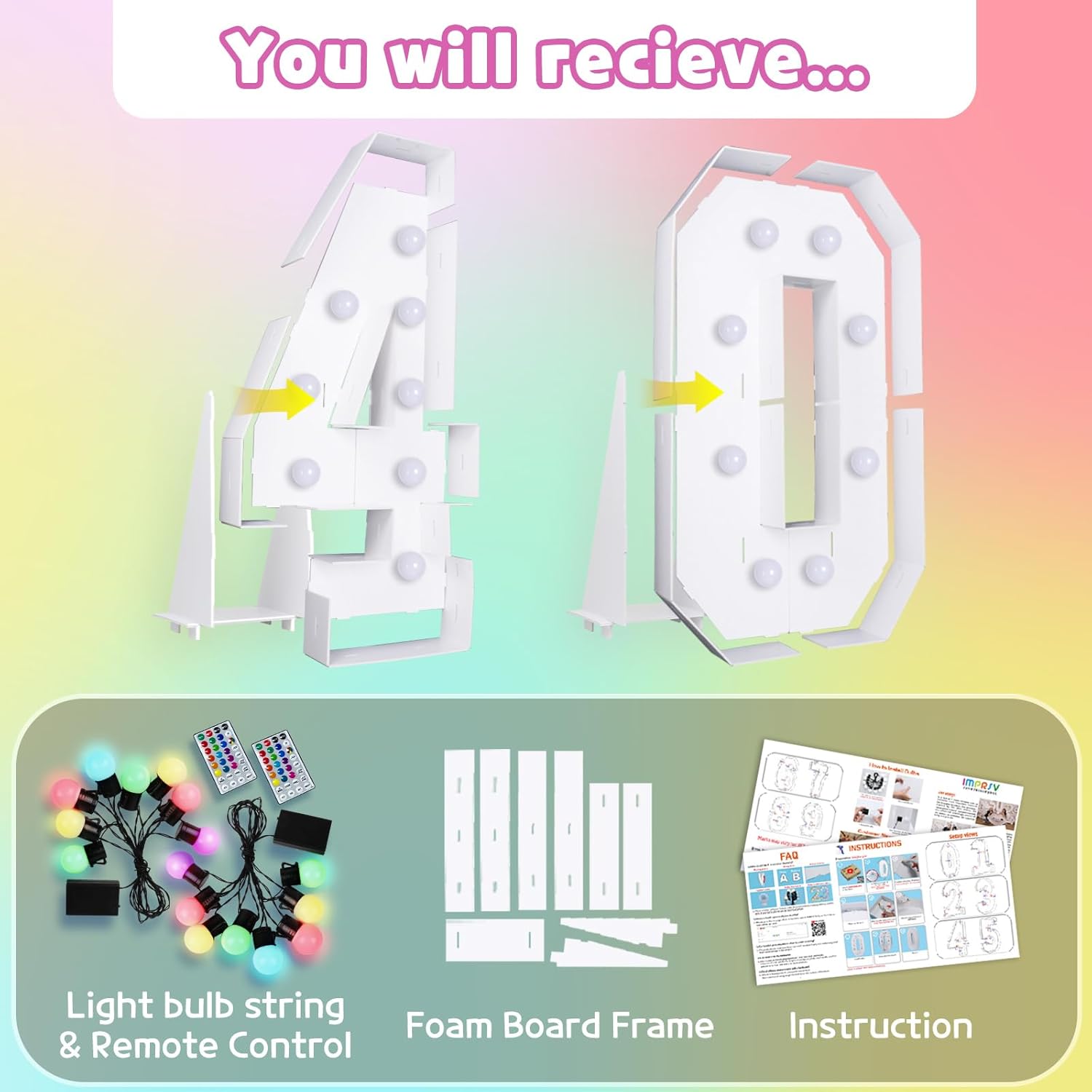 Marquee Numbers 40th-Birthday Decoration: Colorful 3FT Large Light Up 40 Year Old Birthday Decorations Anniversary Backdrop for Boys Girls Cardboard Sign 18 Colors Number 40 Mosaic Balloon Frame