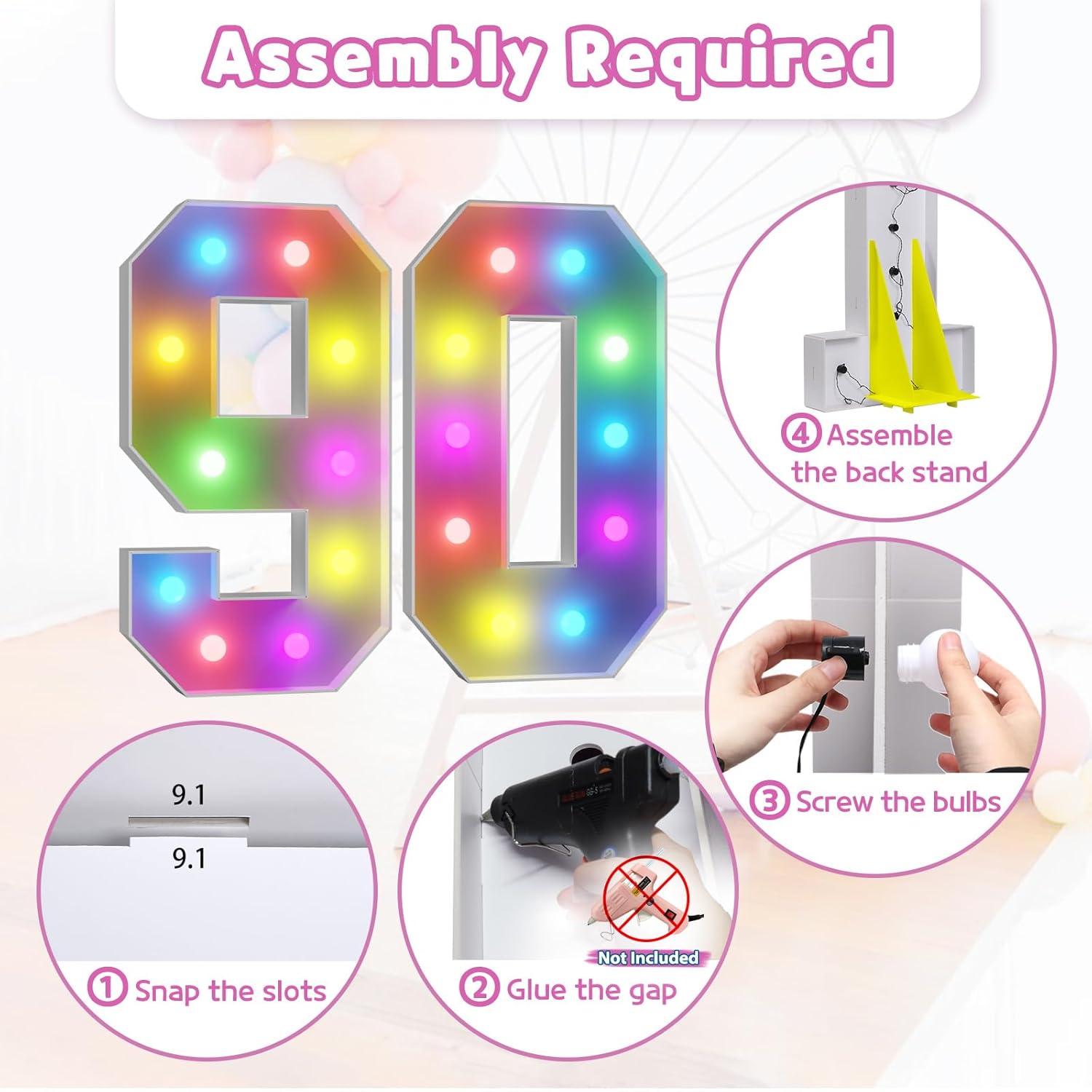 Marquee Numbers 90th-Birthday Decoration: Colorful 4FT Large Light Up 90 Year Old Birthday Decorations Anniversary Backdrop for Boys Girls Cardboard Sign 18 Colors Number 90 Mosaic Balloon Frame