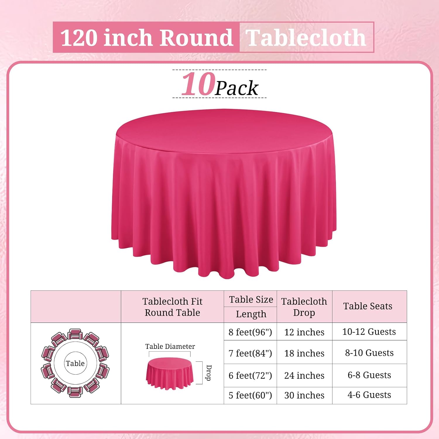 - 【Superior Tablecloth Material】: You will get 10 pack hot pink round tablecloth, this reusable and easy to clean tablecloth is made from premium polyester fabric that resists wrinkling for an always crisp, polished look. Providing more convenience for your using and cleaning.