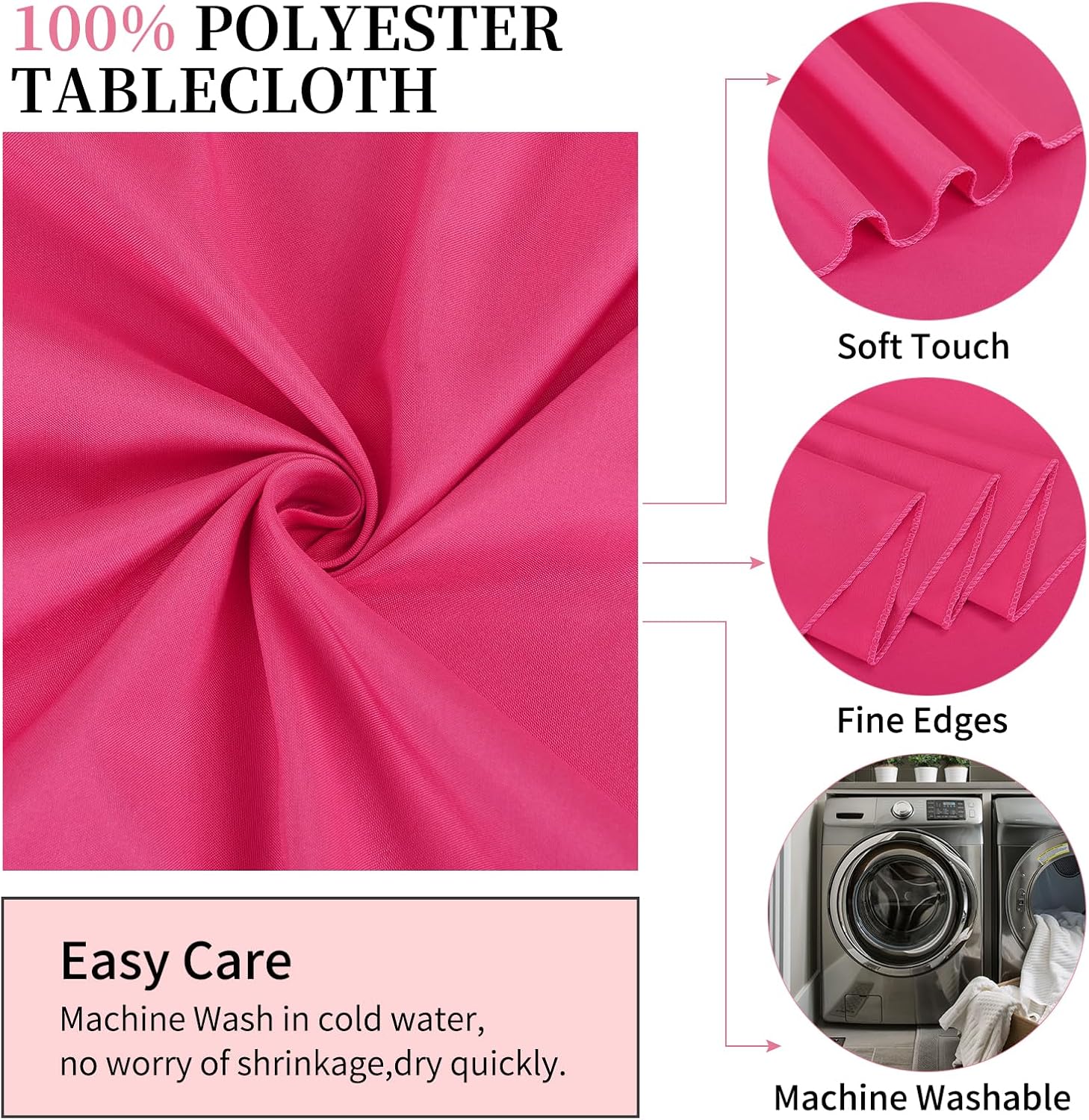 - 【Exquisite Workmanship】: REWOMC tablecloth is made by skilled artisans. The hot pink round tablecloths are designed with folded borders and fine stitching to ensure an elegant look and no loose threads. Our color-fast dyes stay vibrant and true, and will not fade or transfer during washing or use. Can be withstand repeated use and frequent laundering.