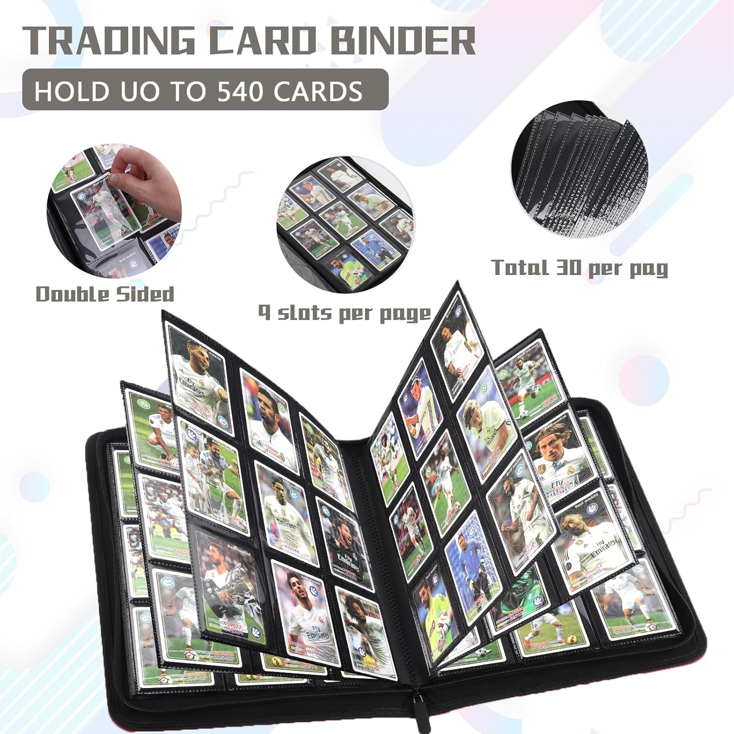 - LARGE CAPACITY CARD STORAGE:Smooth zippered card holder with 9 pockets per page,30 double sided pages hold up to 540 cards,providing plenty of space for card collectors and players to organize their cards