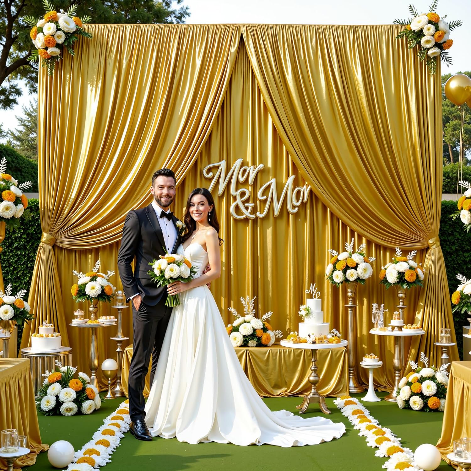 - Dark Gold Drapes for Backdrop Anti-wrinkle:This glitter backdrop curtain made of luminous fabric,it is thick and well-made,the fabric is very smooth and drapes fantastically.it could added some elegance to a event. The material can keeping the natural droop when falls on the floor to perfect for various theme events.