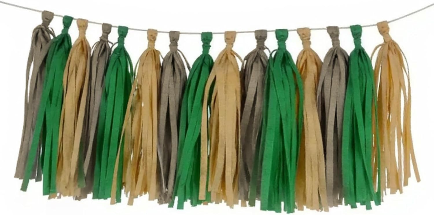Green and Brown Tissue Tassel Garland, Party Decoration Tissue Tassel Banner, Set of 15 Pieces