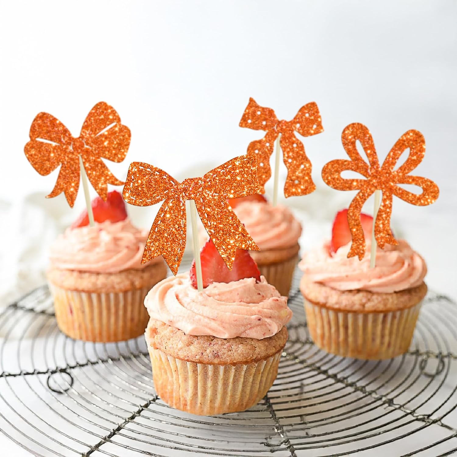 Ephlyn 24Pcs Bow Cupcake Toppers Bow Birthday Cake Topper Girls Birthday Party Decorations Bowknot Cupcake Decorations for Bridal Baby Shower Birthday Wedding Themed Party Orange