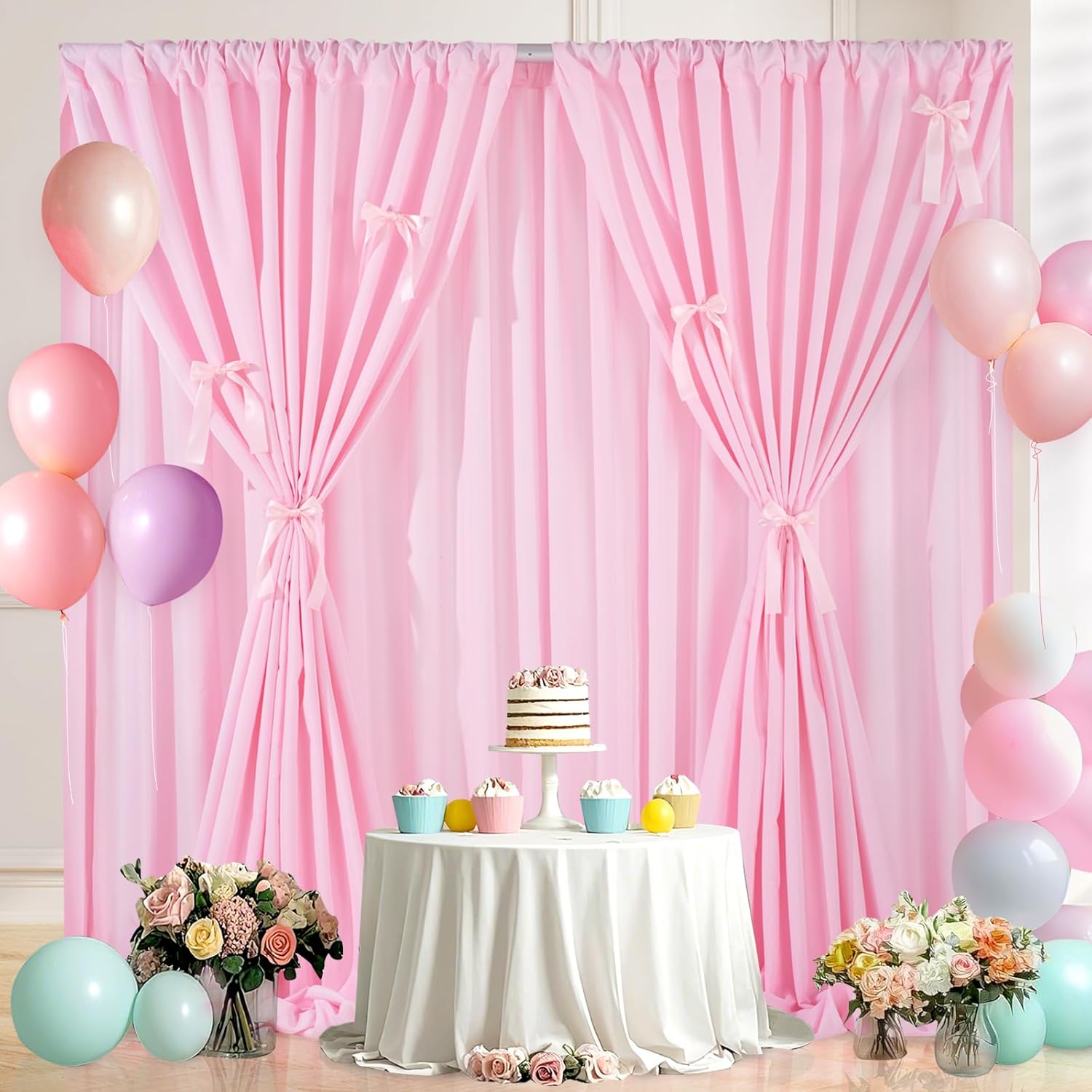 - 【Package Includes】: Included 2 panels 5.8x8ft polyester background, 20 double - sided satin bows and 2 pack of rubber bands, let you DIY your own unique decoration!