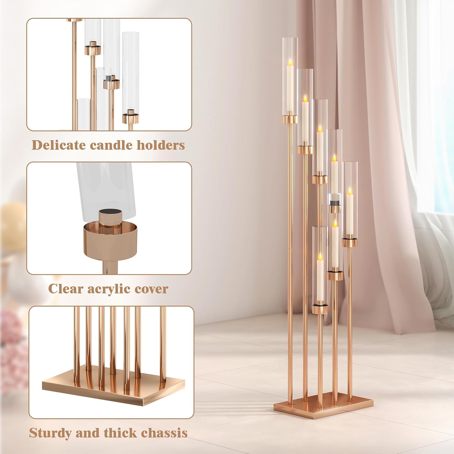 - UNIQUE DESIGN: Our 4pcs floor candle holders for wedding is 7 heads, the whole is arranged from high to low, staggered, very unique, the appearance is golden, elegant and noble. Note: Our products feature a protective film on the bottom. Simply peel it off to reveal the gold finish. This film is included to prevent scratches on the product