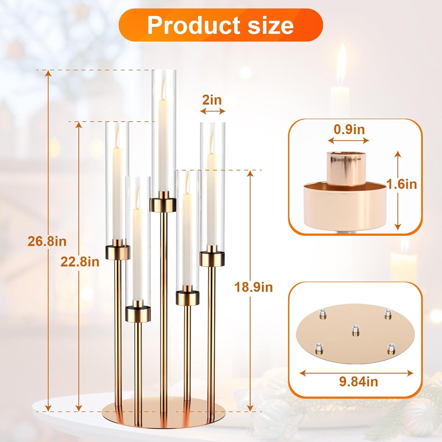 - 4 SET 5 ARM FLOOR CANDELABRAS : our floor candelabra is 4 pieces set of 5 head candle holders, the product has 3 heights, which are 25.98in, 22.02in, 18.11in, very suitable size. Each candle holder contains 5 removable shades, the height is 9.8in, the diameter is 2in, the whole set is perfect for many occasions