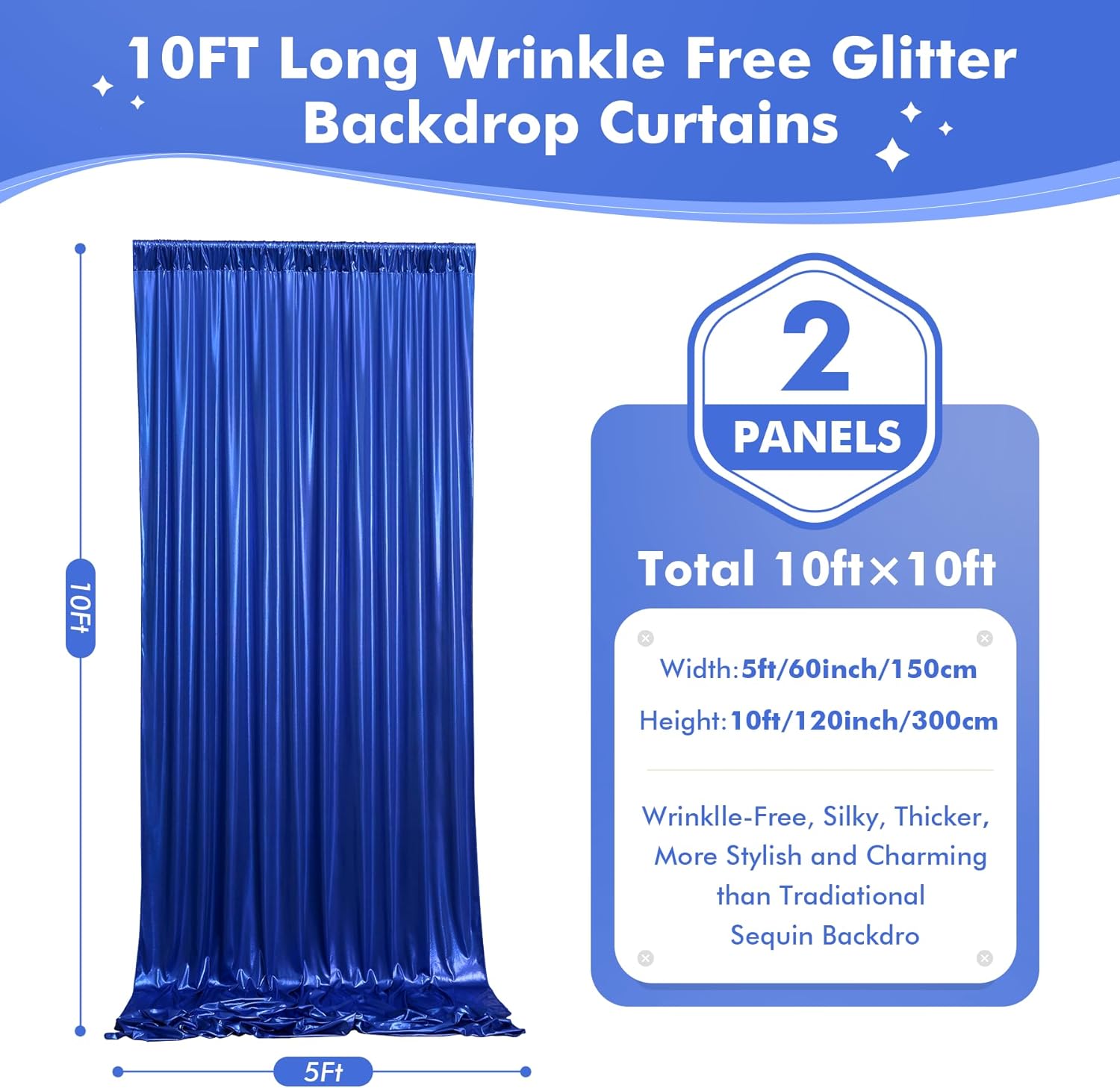 - Wrinkle-Free Backdrop Curtain - Our 10ft royal blue sequin glitter party background curtain panels are made of wrinkle-free material, which could be used without ironing. Let you make unforgettable memories for your family or your friends.