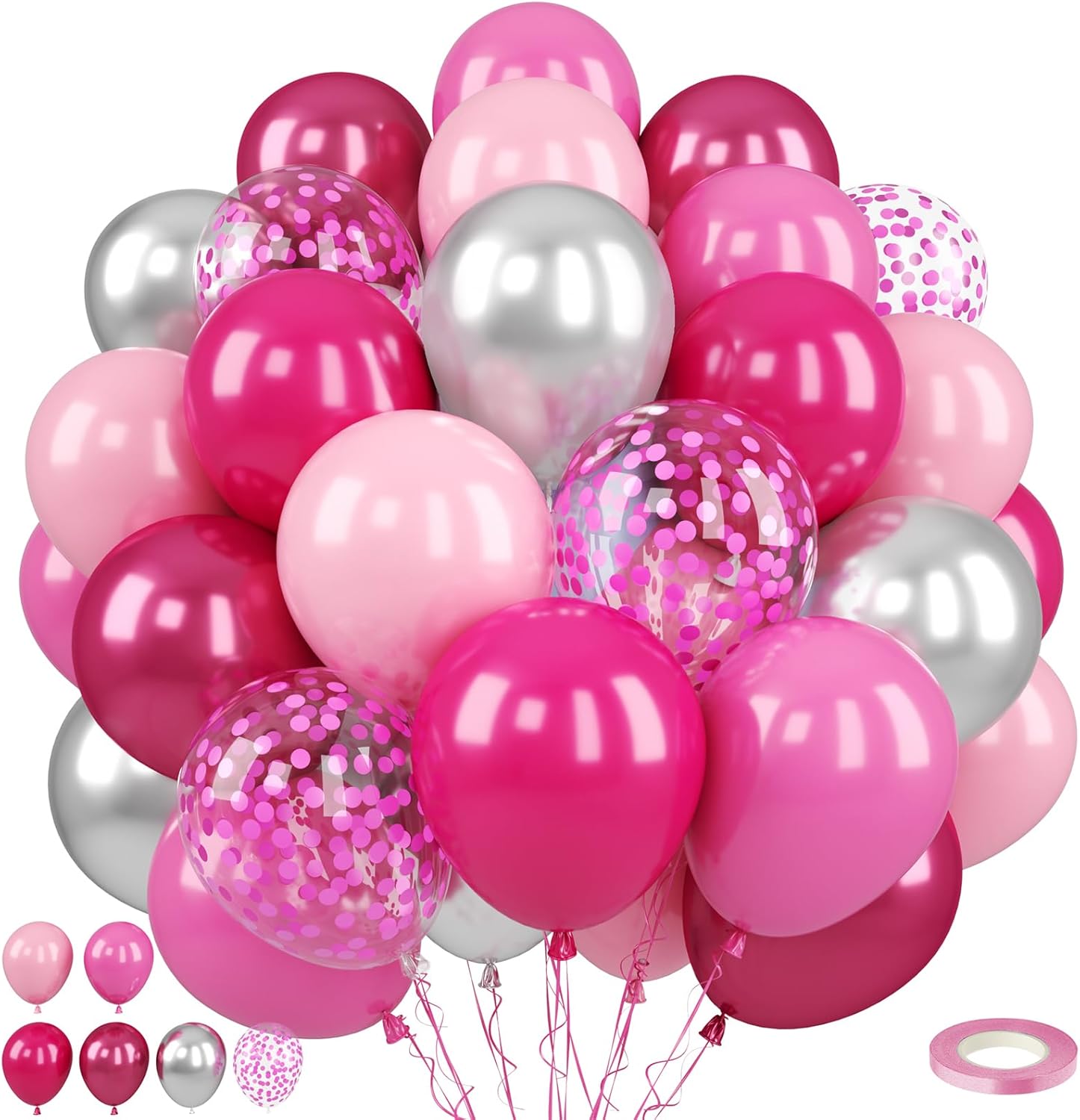 - What You Get - The pink balloons include 50 balloons, 6 distinct colors: hot pink balloons x 10, mattee pink balloons x 10, light pink balloons x 12, retro translucent rose red balloons x 6, dark pink confetti balloons x 5, Metallic silver balloons x 4. Accompanying by a 10m ribbon. These striking and captivating hues will beautifully enhance your memorable and enjoyable moments!