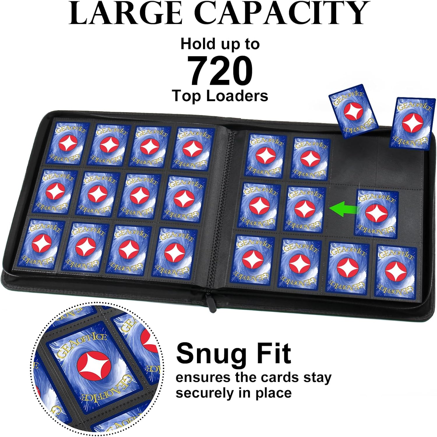 - Large Capacity - With 30 double-sided pages and 12 pockets per page, this trading card binder can hold up to 720 cards. Provides plenty of space for you to organize all your trading cards.