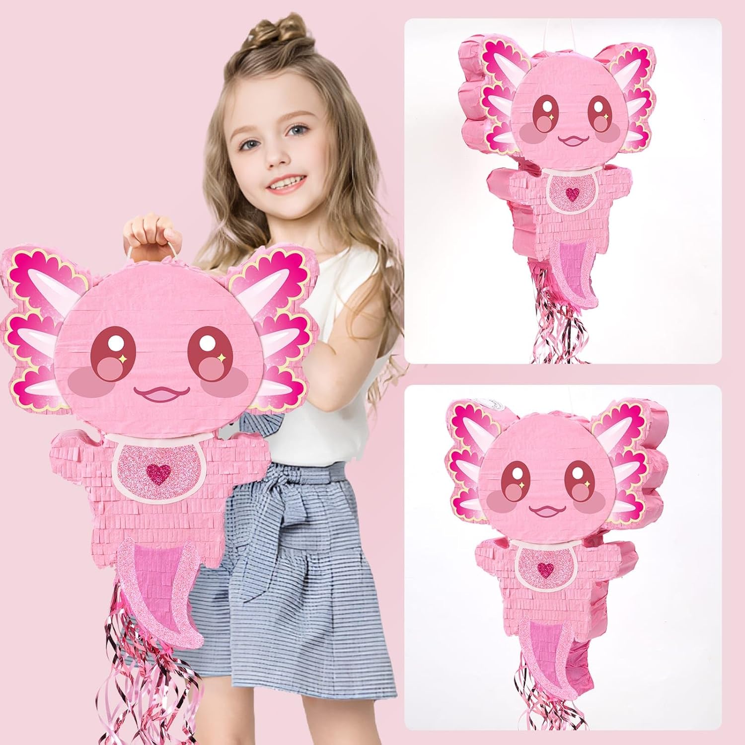 - AXOLOTL PINATA - Axolotl Cuddle Party! Meet your new aquatic BFF—this impossibly cute axolotl piñata boasts giant sparkly eyes, wiggly gills, and a heart bib that seems say ‘Hug Me!’ Whack it open for a shower of rainbow treats and squishy toys. Perfect for birthday splashes or just because you’re axo-obsessed!