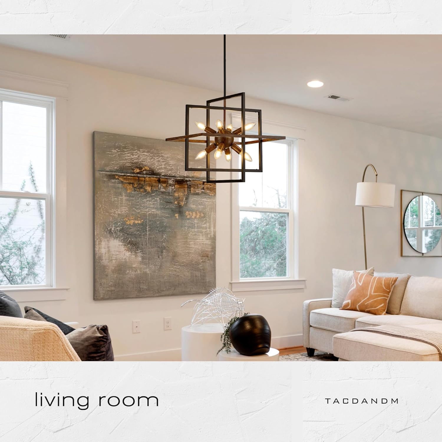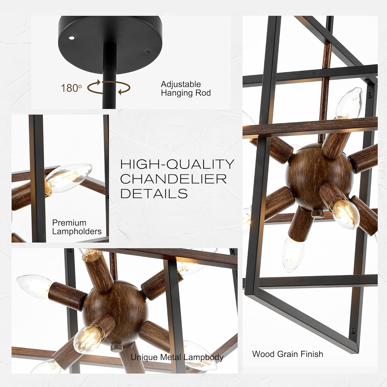 - 【Geometric Design】This 8-light lantern pendant light combines wooden structure with black metal frame, blending minimalist and natural beauty to exude a charming rustic vibe with a touch of modern industrial sophistication.Embedded in a rectangle industrial-style cage, the Rectangular Chandelier creates a starburst and modern art sense. Ideal for living room, kitchen island, dining room, hallway, stairway, entryway, café & restaurant.