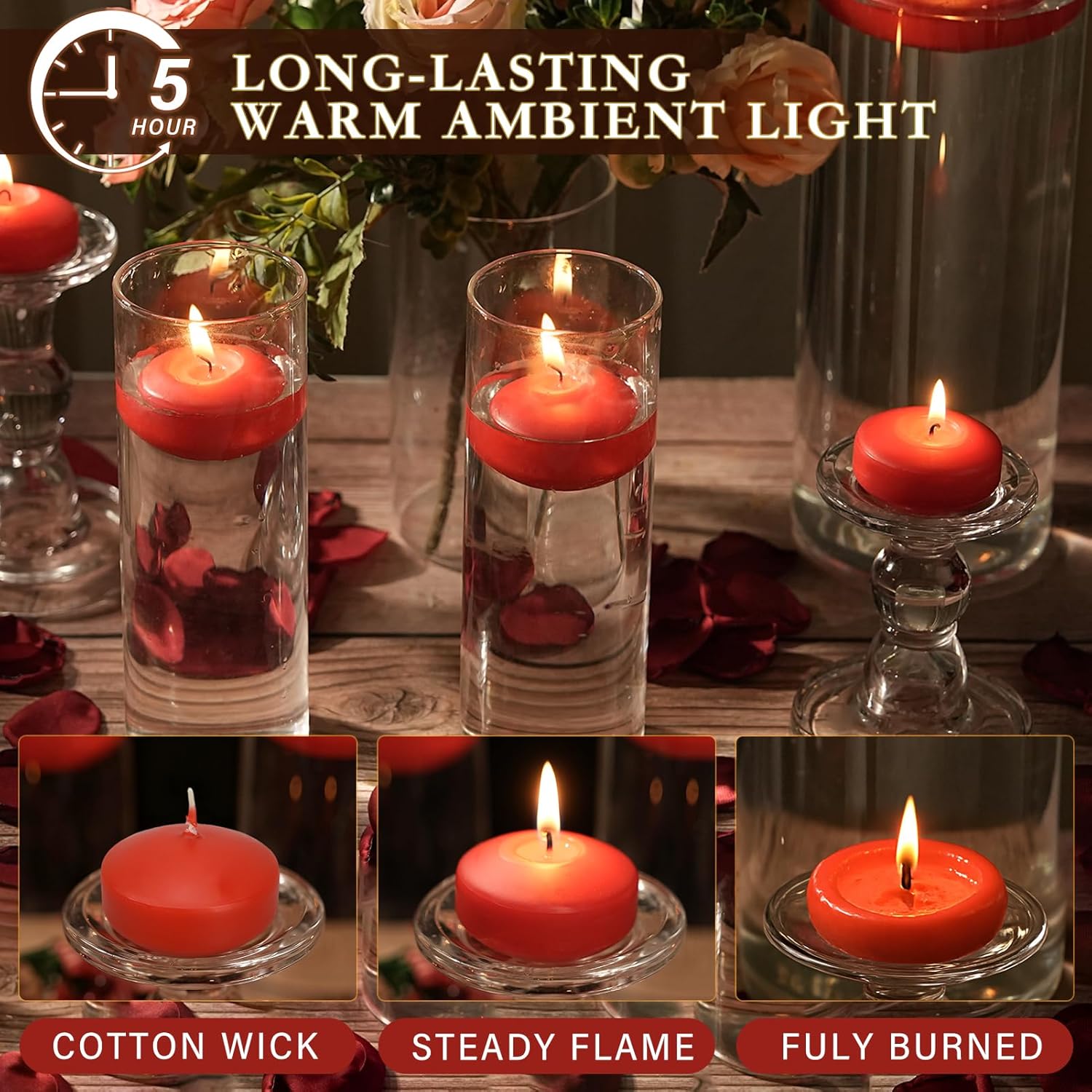 - 【LONG-LASTING & CLEAN BURNING 2 IN FLOAT CANDLES】Made high-quality paraffin wax, ensuring a bright, steady flame and a clean burn, these red floating candles provide a long and steady burn time of 5-6 hours. They are unscented and drip-resistant, ensuring a clean burn without mess. Ginitiri floating candles are hypoallergenic,ideal for water decorations in pools, bathtubs, or centerpiece vases