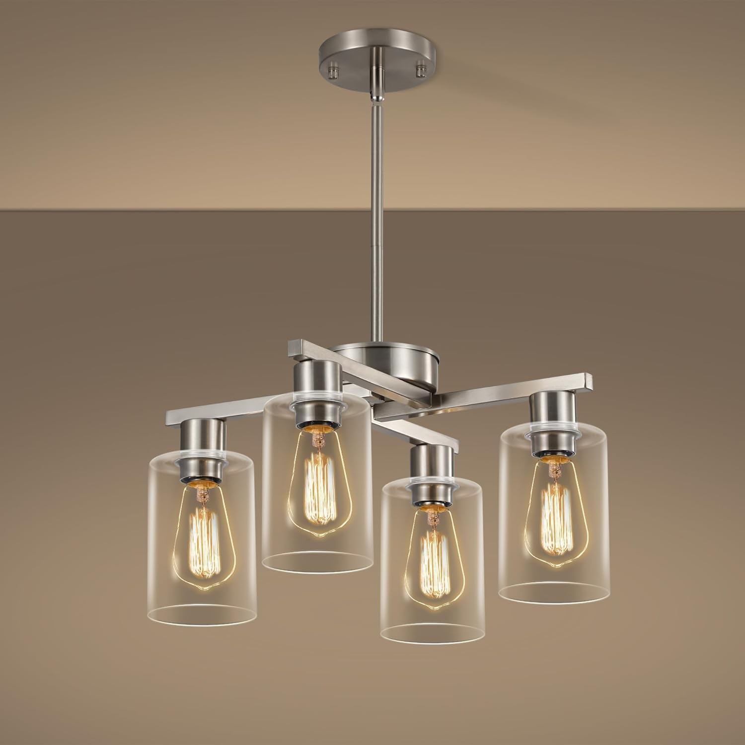 - 【Unique Contemporary Design】 This brushed nickel chandelier features two elegant "Y"-shaped arms paired with 4 cylindrical glass shades, creating a sleek yet visually striking geometric silhouette. Its simple yet sophisticated design seamlessly complements various spaces, including modern kitchen island, industrial-style dining areas, and farmhouse foyer. When lit, it emits a warm and premium glow, serving as a eye-catching focal point in any room.