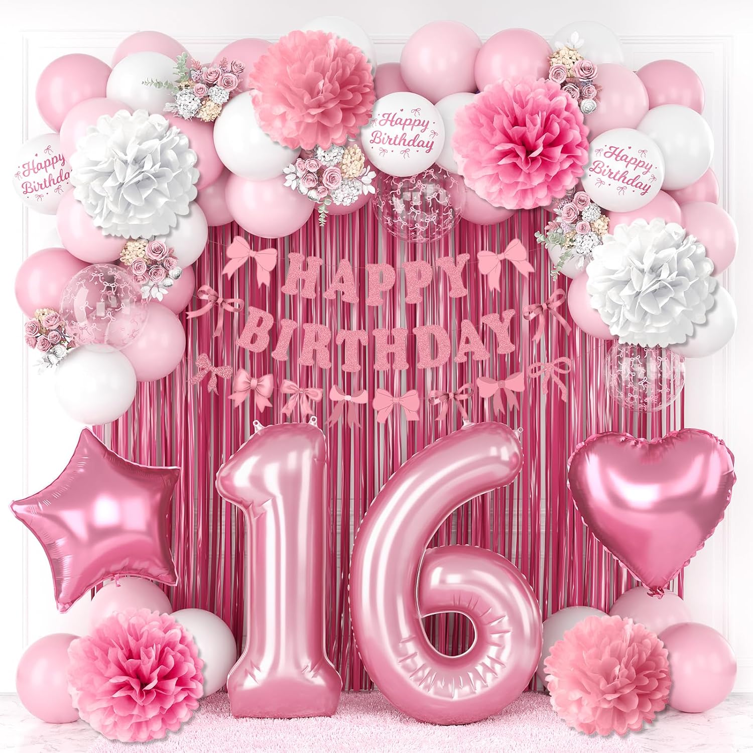 - ALL-IN-ONE DECORATION: Includes pearl pink number 16 balloon, bow “Happy Birthday” banner, pom poms, fringe curtain, foil balloons, latex balloons, special printed balloons, and ribbon – a complete set to decorate your party easily; designed especially for girls turning sixteen, this decoration set is ideal for birthday parties, home celebrations, and photography scenes, making the day extra memorable