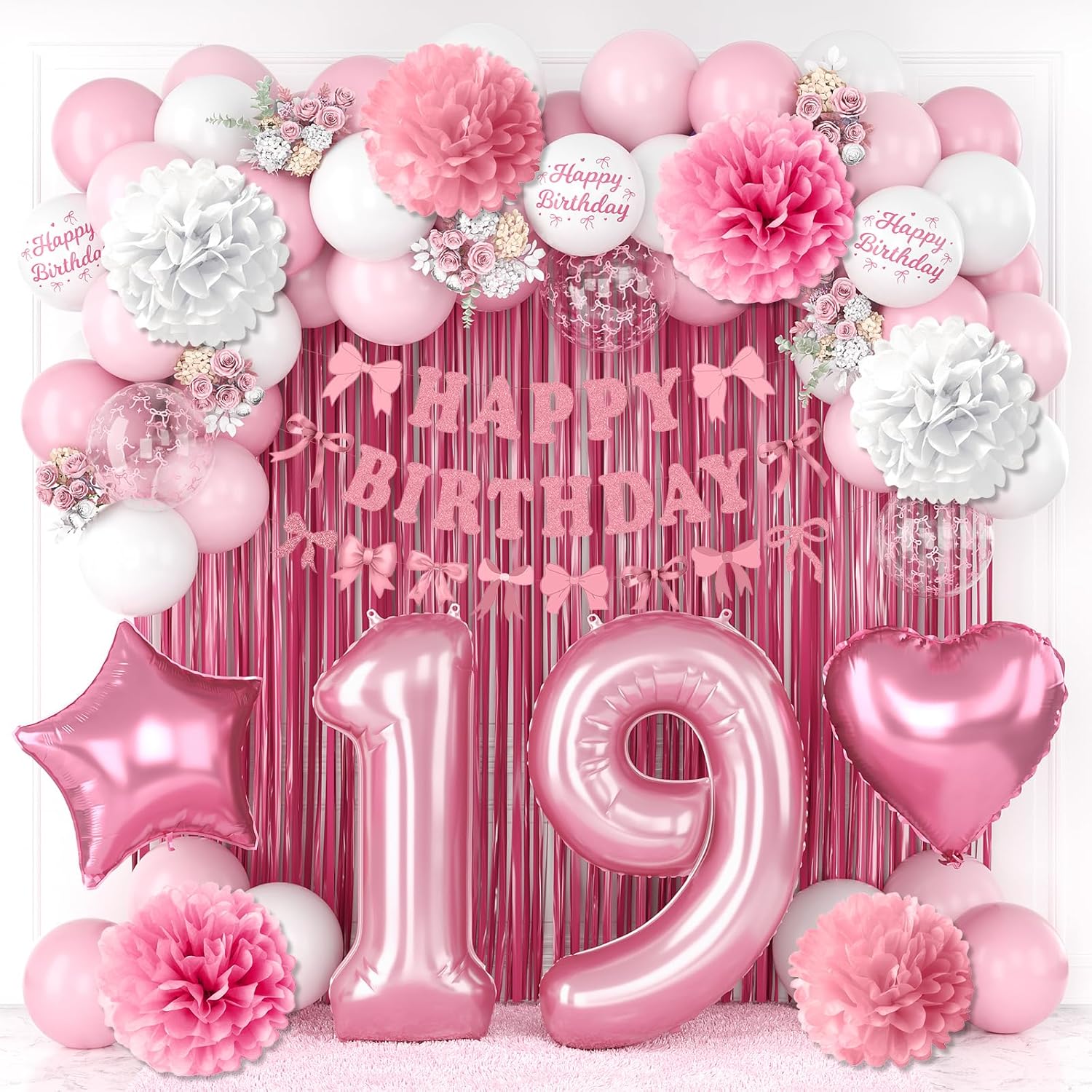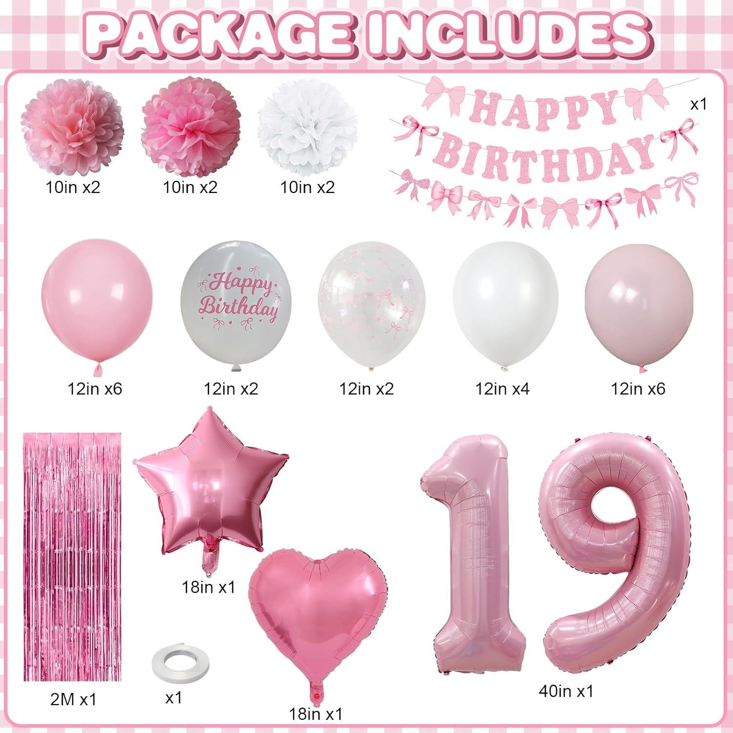 - PACKAGE INCLUDES: 1pc pearl pink number 19 balloon, 1pc bow happy birthday banner, 2pcs pink paper pom poms, 2pcs light pink paper pom poms, 2pcs white paper pom poms, 1pc pink curtain, 1pc light pink star foil balloons, 1pc light pink heart foil balloons,6pcs light pink balloons, 6pcs pastel pink balloons, 4pcs white balloons, 2pcs birthday printed balloons, 2pcs bow clear balloons, 1pc ribbon