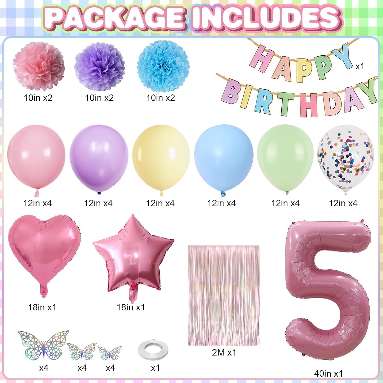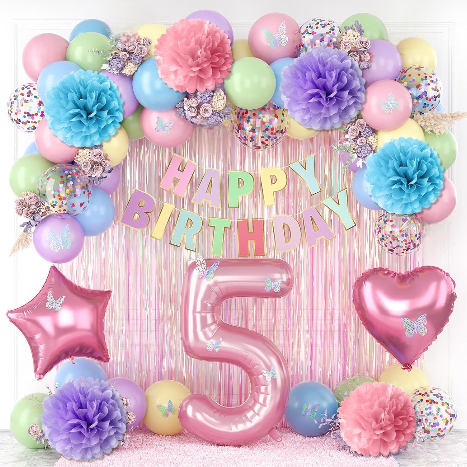 - PACKAGE INCLUDES: 1pc pearl pink number 5 balloon, 1pc happy birthday banner, 2pcs light pink paper pom poms, 2pcs light purple paper pom poms, 2pcs light blue paper pom poms, 1pc colorful white curtain, 1pc light pink star foil balloons, 1pc light pink heart foil balloons, 4pcs pastel purple balloons, 4pcs pastel pink balloons, 4pcs pastel blue balloons, 4pcs pastel green balloons, 4pcs pastel yellow balloons, 4pcs colorful confetti balloons, 1pc butterfly stickers set, 1pc ribbon