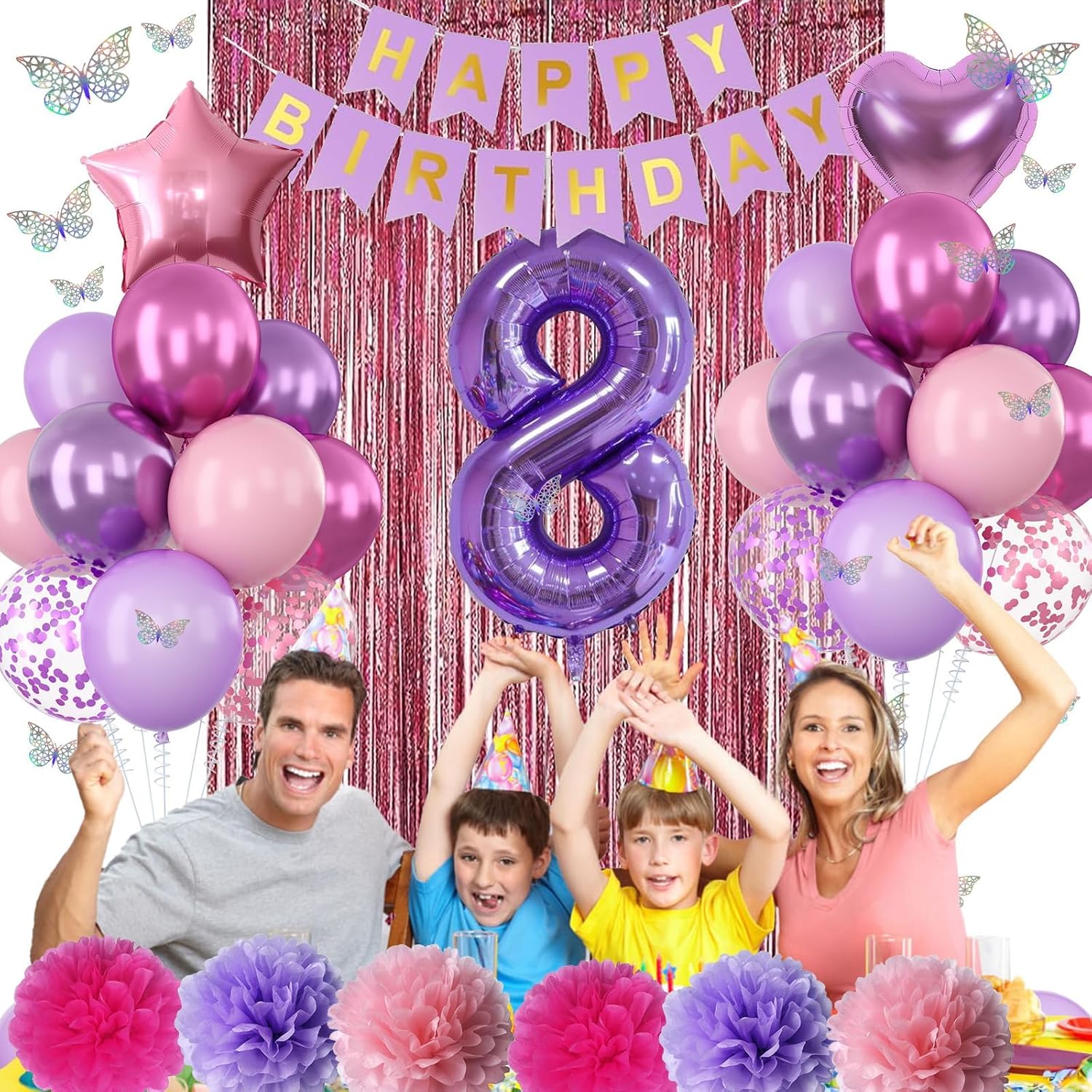 - PACKAGE INCLUDES: 1pc purple number 8 balloon, 1pc happy birthday banner, 2pcs light pink paper pom poms, 2pcs light purple paper pom poms, 2pcs hot pink paper pom poms, 1pc light pink fringe curtain, 1pc light pink star foil balloons, 1pc light purple heart foil balloons, 6pcs pastel purple balloons, 6pcs pastel pink balloons, 4pcs metallic purple balloons, 4pcs metallic magenta balloons, 3pcs purple confetti ballons, 3pcs pink confetti ballons, 1pc butterfly stickers set, 1pc ribbon