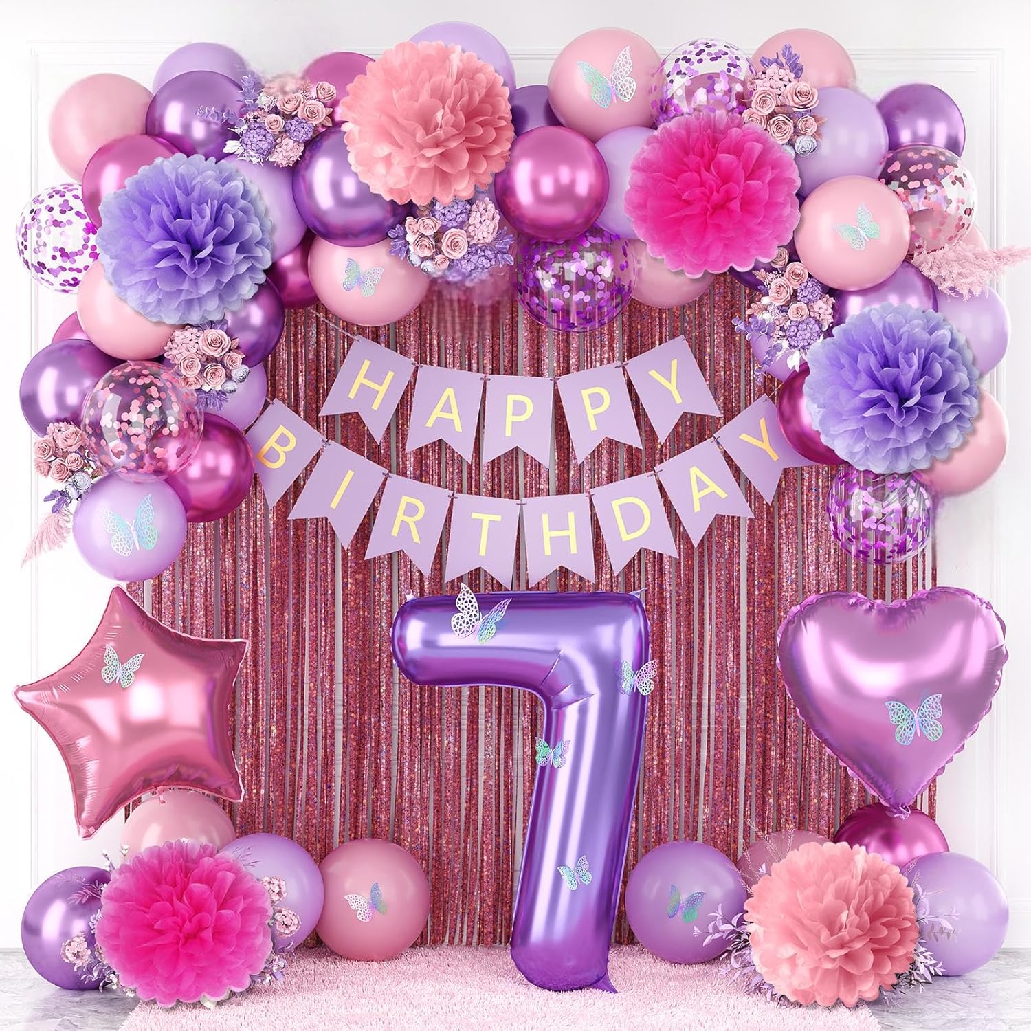 - PACKAGE INCLUDES: 1pc purple number 7 balloon, 1pc happy birthday banner, 2pcs light pink paper pom poms, 2pcs light purple paper pom poms, 2pcs hot pink paper pom poms, 1pc light pink fringe curtain, 1pc light pink star foil balloons, 1pc light purple heart foil balloons, 6pcs pastel purple balloons, 6pcs pastel pink balloons, 4pcs metallic purple balloons, 4pcs metallic magenta balloons, 3pcs purple confetti ballons, 3pcs pink confetti ballons, 1pc butterfly stickers set, 1pc ribbon