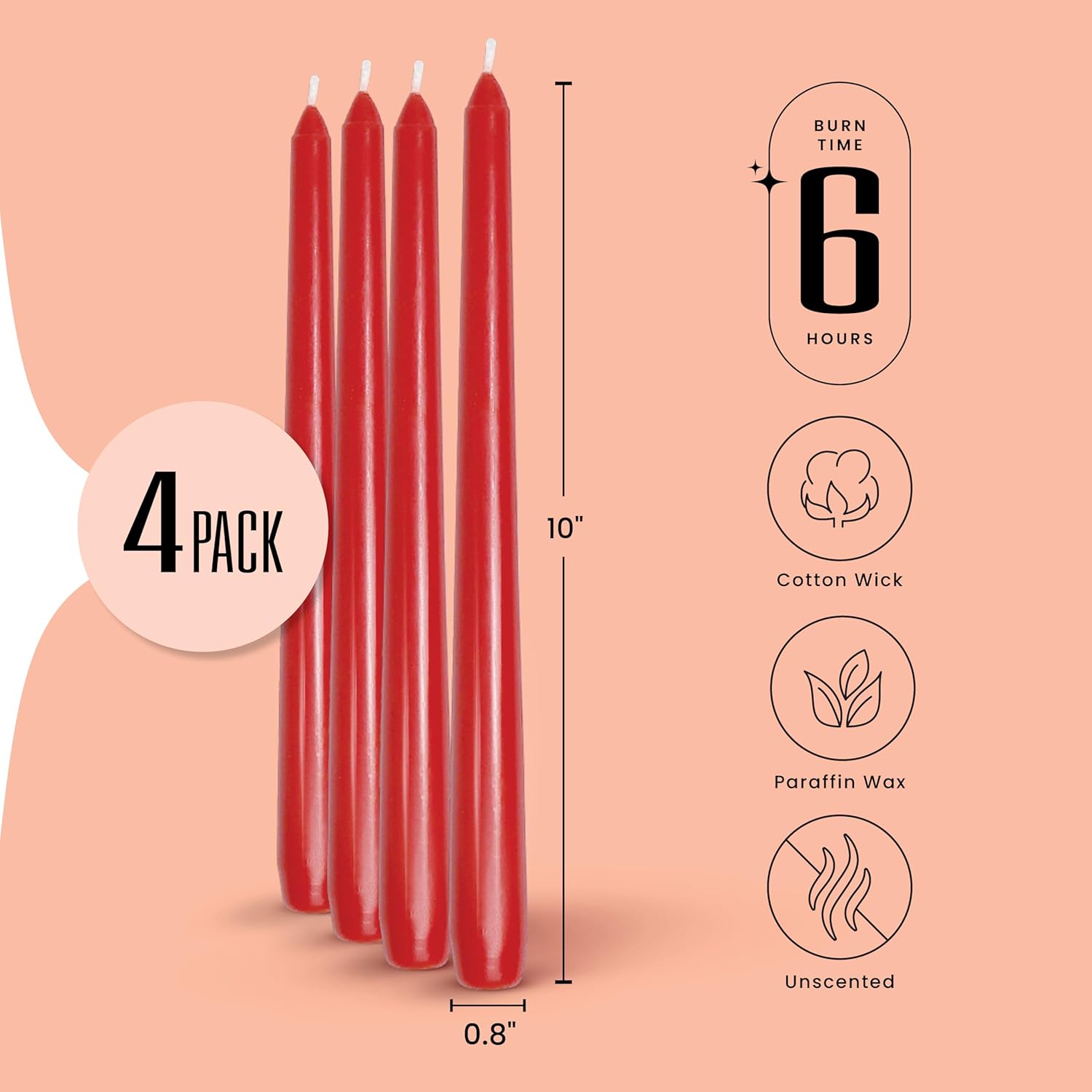 - Long-Burning Red Tapered Candles – Each 10” red candle provides up to 6 hours of fragrance-free light. Perfect for Valentine’s dinners, anniversaries, or holiday gatherings, these tall candlesticks add passion and warmth to tablescapes and décor.