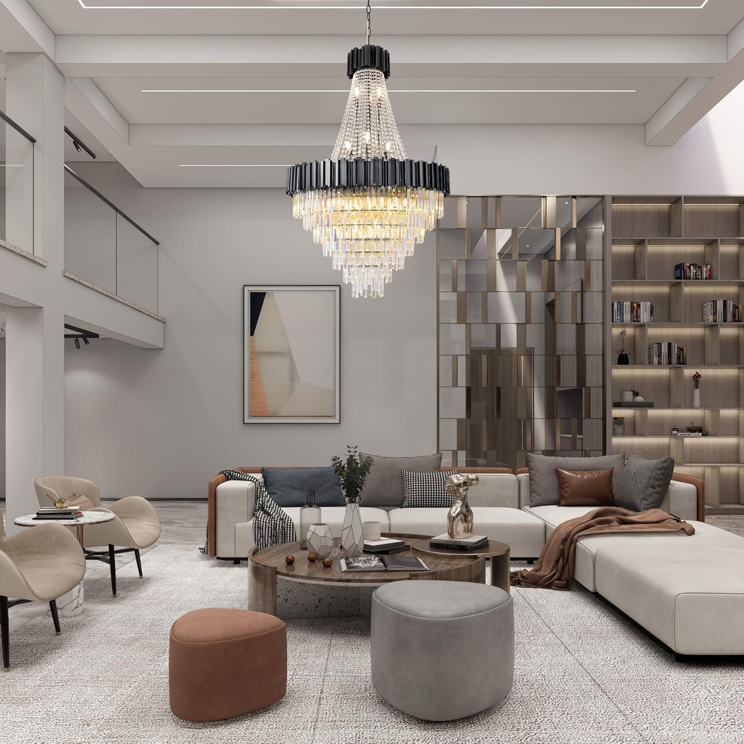 - 【Luxury High Ceiling Chandelier】This stunning modern chandelier is crafted with premium matte black frame and 100% top K9 transparent crystals that exude a diamond-like brilliance. With 420 sparkling crystals adds brilliance and sophistication, each crystal refracts light beautifully, creating a dazzling, luxurious atmosphere for your home.